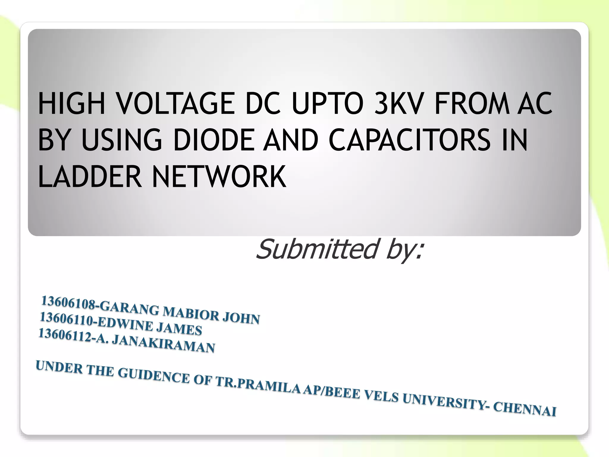 The document details a project that designs a high voltage DC power supply, converting single-phase AC to an output of up to 10 kV, with a recommended safe output of 2 kV for student use. It employs a voltage doubler circuit using multiple silicon diodes and electrolytic capacitors for voltage multiplication. The project includes safety measures such as a potential divider for voltage measurement and resistors for discharging capacitors.