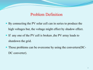 The document discusses the design of a high voltage step-up DC-DC converter using coupled inductor and switched capacitor techniques. It aims to achieve a high step-up voltage gain by charging capacitors in parallel and discharging them in series through a coupled inductor. This allows an input voltage of 24 volts to output 400 volts at an appropriate duty ratio. The converter design is analyzed and its simulation results in a 400 volt output voltage without ripples are presented. A plan of action with timeline is also provided to fabricate and test the converter.
