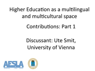 The document discusses various aspects of higher education as a multilingual and multicultural space, highlighting contributions from several speakers at a roundtable in Madrid. Key topics include the promotion of multilingualism, challenges facing bilingual programs, and the implementation and support for English medium instruction in various universities. A focus is placed on the need for careful planning and language policies to enhance linguistic diversity and address challenges related to teaching and student engagement in multilingual settings.