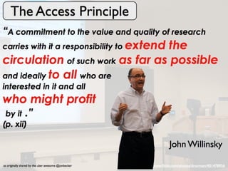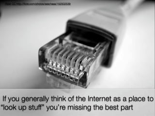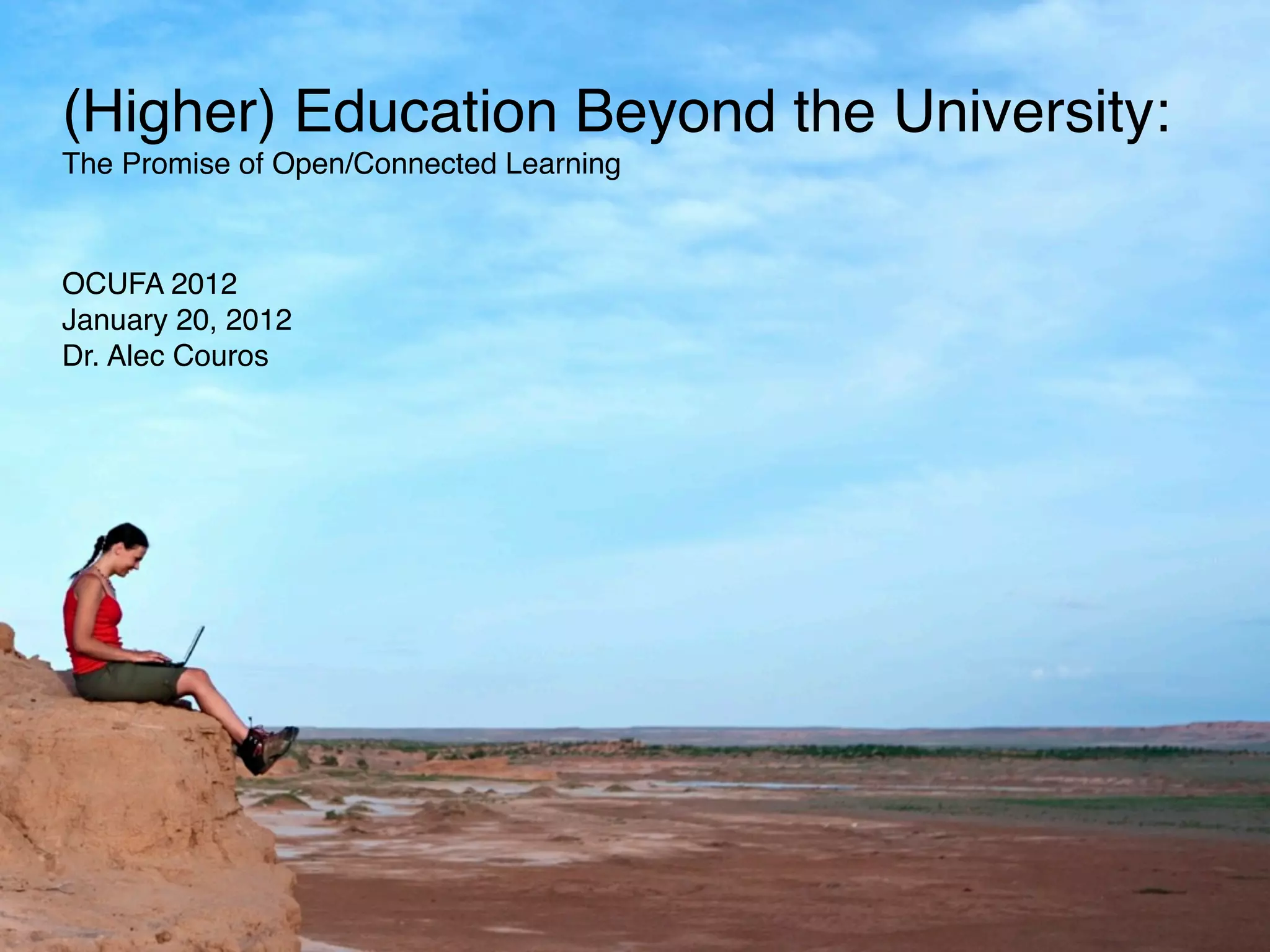 This document discusses the potential of open and connected learning beyond traditional universities. It notes that new technologies and tools allow academics to build online presences and connect with peers and students in new ways. Open educational resources and open online courses are mentioned as part of this transformation. The potential for open sharing of knowledge, resources and ideas is discussed. Challenges to traditional concepts of education and learning are also presented, given that learning can now happen anywhere through open and connected means.