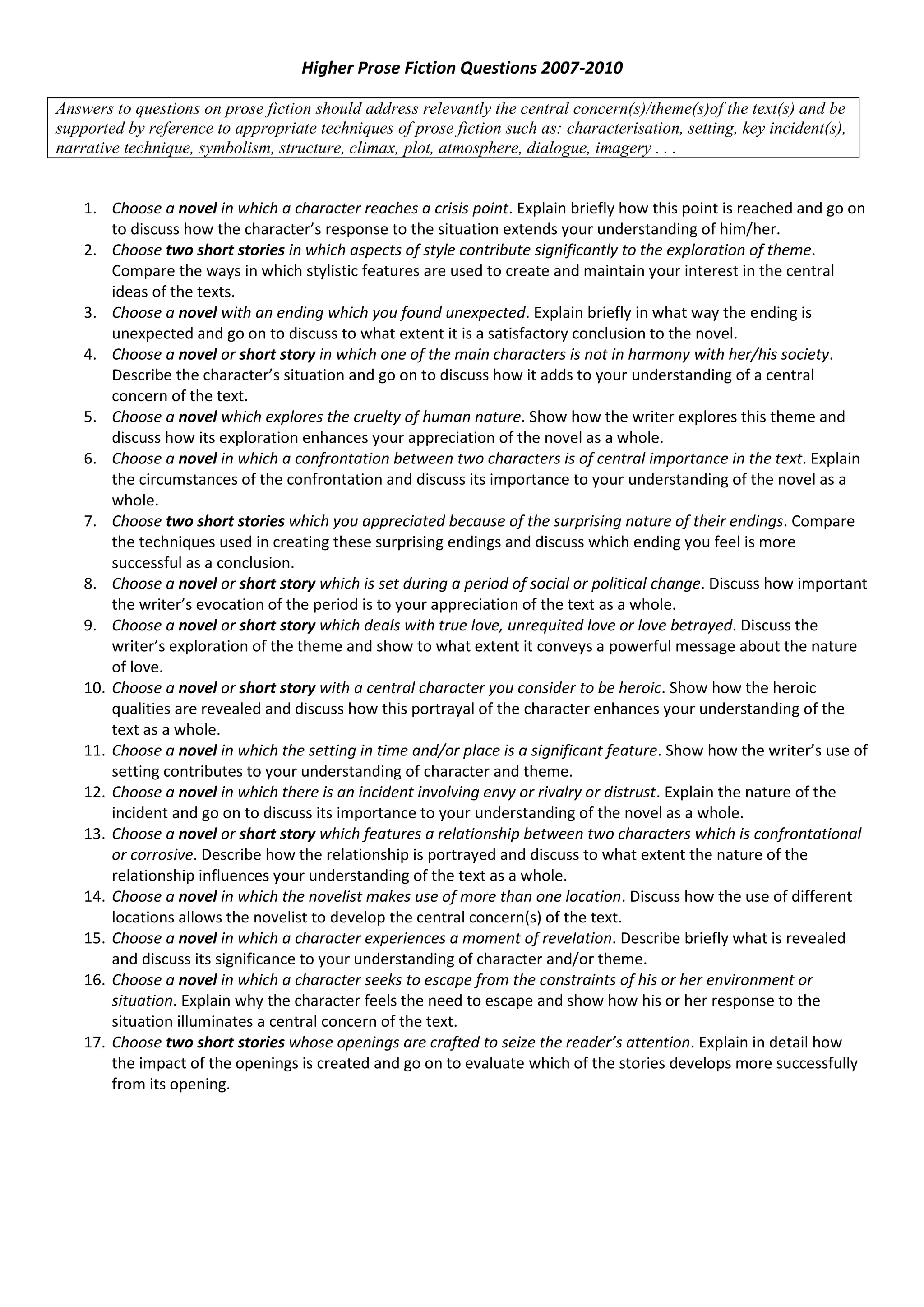 The document provides a list of potential prompts for analyzing prose fiction works. The prompts ask the reader to choose novels or short stories and discuss how specific elements like characters, themes, styles, settings, and plot points enhance their understanding of the text. Some examples of prompts include discussing how a character's response to a crisis point extends understanding of them, comparing how stylistic features create and maintain interest in central ideas between two short stories, and explaining how a character's need to escape their environment or situation illuminates a central concern of a novel.
