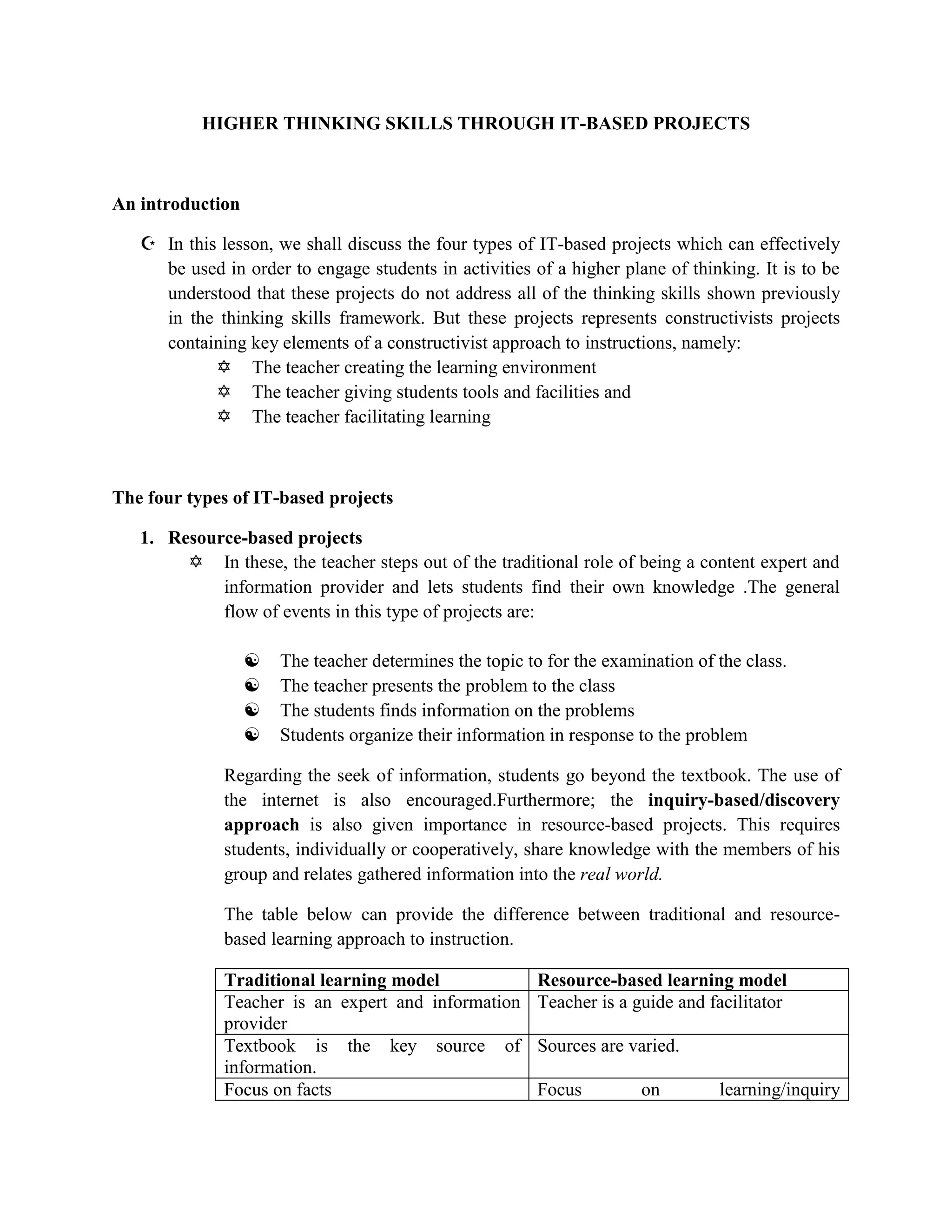 This document discusses 4 types of IT-based projects that can engage students in higher-level thinking: