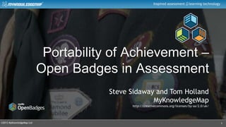 The document discusses the concept of open badges in assessment, emphasizing their role in recognizing skills and achievements in various fields, particularly in education and healthcare. It outlines the development of open badges, including the launch of Open Badges 1.0 by Mozilla, and mentions the growing list of organizations utilizing this technology. Key components include badge design, issuance, and integration into educational platforms to motivate participation and engagement.
