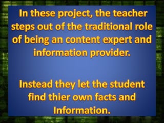 This document discusses using IT-based projects to develop higher thinking skills. It outlines a teacher's role in creating an environment that provides students with tools and facilities to facilitate learning. The process involves the teacher presenting a problem to the class, students finding information to respond to the problem, and organizing their findings. Traditional learning focuses on textbooks and facts while resource-based learning emphasizes inquiry, varied sources, and a focus on the learning process over products. The document also describes a 5-step process for simple IT-based creation that involves defining tasks, brainstorming, judging ideas, taking action, and allowing flexibility.