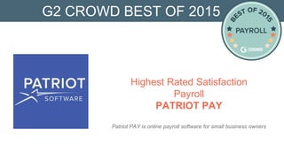 The document discusses G2 Crowd's Best of 2015 report which highlights the top rated products in various categories such as payroll, based on reviews from over 50,000 users on G2 Crowd. It specifically lists the highest rated payroll products as Patriot PAY, Wagepoint, and Fuse Workforce Management, which are online payroll software tools for small businesses.