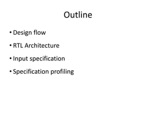 The document outlines hardware synthesis design processes, focusing on RTL architecture with optimizations like variable and operation merging, register sharing, and pipelining techniques. It discusses scheduling algorithms and emphasizes the need for system-level design to manage growing complexities in technology. Future work includes exploring timed transaction-level modeling (TLM), incorporating RTOS models, and synthesizing designs for FPGA prototyping.