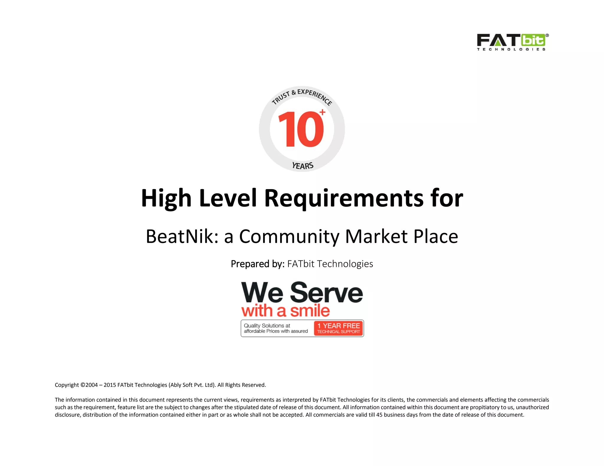 The document outlines requirements for a community marketplace called BeatNik that connects students and instructors. It describes features like user profiles, class listings, forums, contests, payments, and dashboards for students and instructors. Key points are: