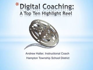Andrew Halter is the instructional coach for the Hampton Township School District. He focuses on using technology to support assessment and implementing best practices through embedded professional development like coaching teachers daily and working on long-term district goals. Some examples provided include having students role play emergency scenarios to apply math skills, create videos to teach chemistry concepts to future students, and design travel websites or dramatic readings to engage with history content in real world ways.
