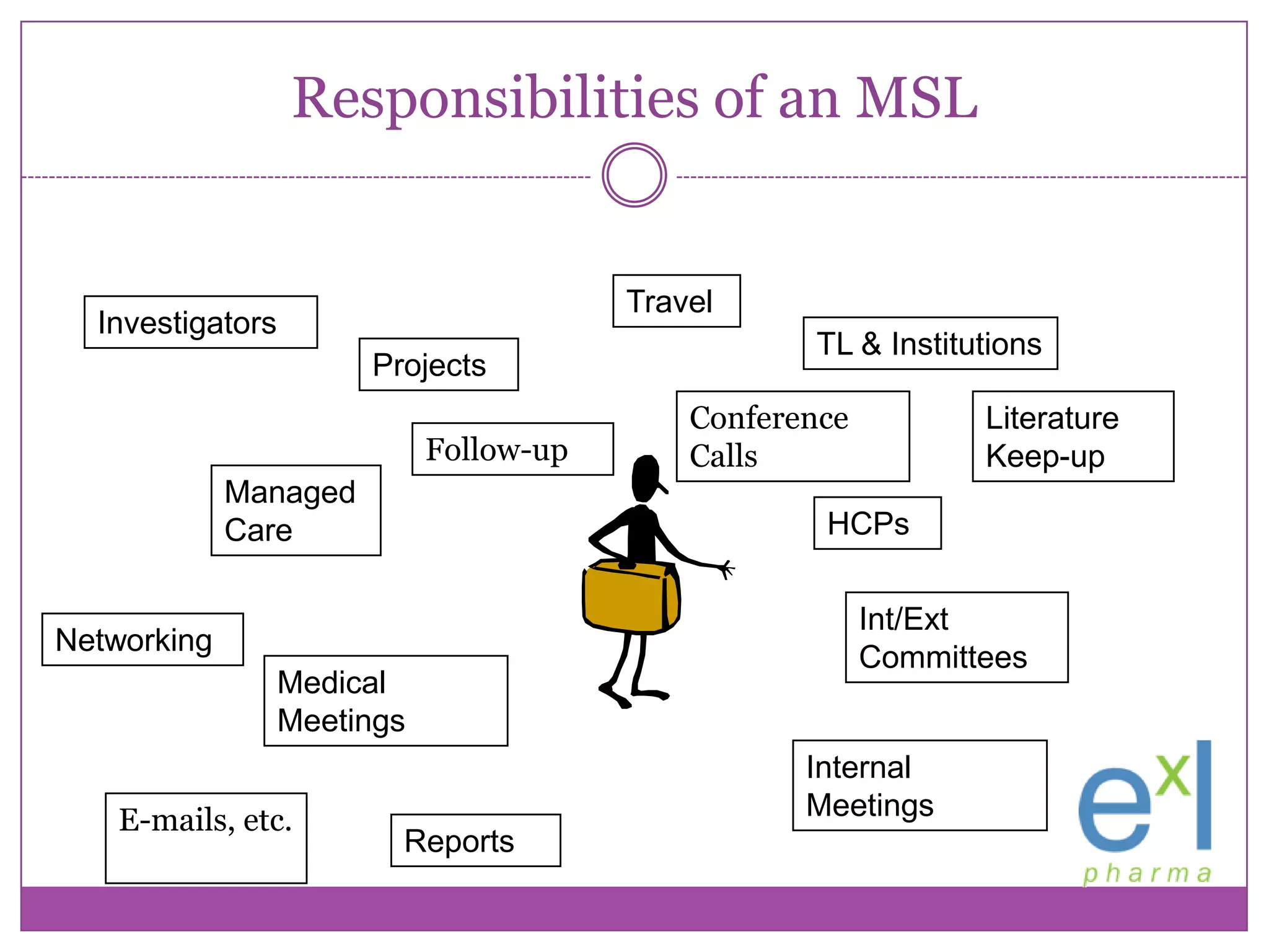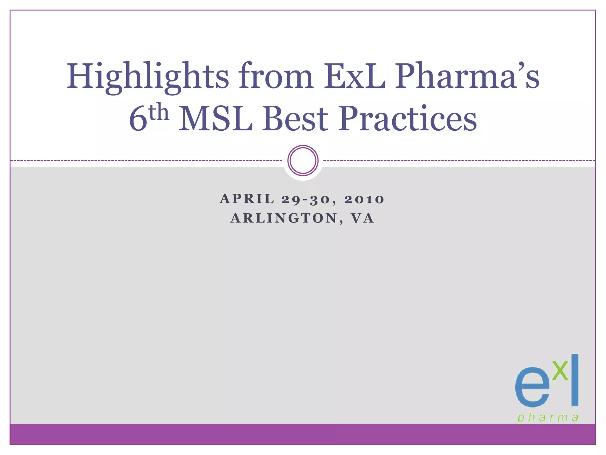 This document summarizes key points from ExLPharma's 6th annual MSL Best Practices conference. It discusses the evolving role of medical science liaisons (MSLs) and how they can effectively educate healthcare providers while minimizing compliance risks. The role of MSLs is varied by company but generally involves building scientific relationships with key opinion leaders. The document provides guidance on developing standard operating procedures for MSLs, clarifying their reporting structure, compensation practices, involvement in clinical trials and interactions with sales representatives to reduce promotional concerns. It emphasizes the need for MSL training, oversight and auditing to ensure their activities remain focused on non-promotional scientific exchange.