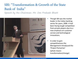 This document discusses examples of successful Indian companies and their business practices. It summarizes speeches from the chairman of SBI Bank about their "Project Parivartan" transformation initiative in response to new competition. It also discusses the effective operations of Mumbai's dabbawala food delivery network with near-perfect performance and customer satisfaction. Finally, it outlines Infosys' growth from a small startup to a global IT leader, and how they develop future leaders through specialized training programs.