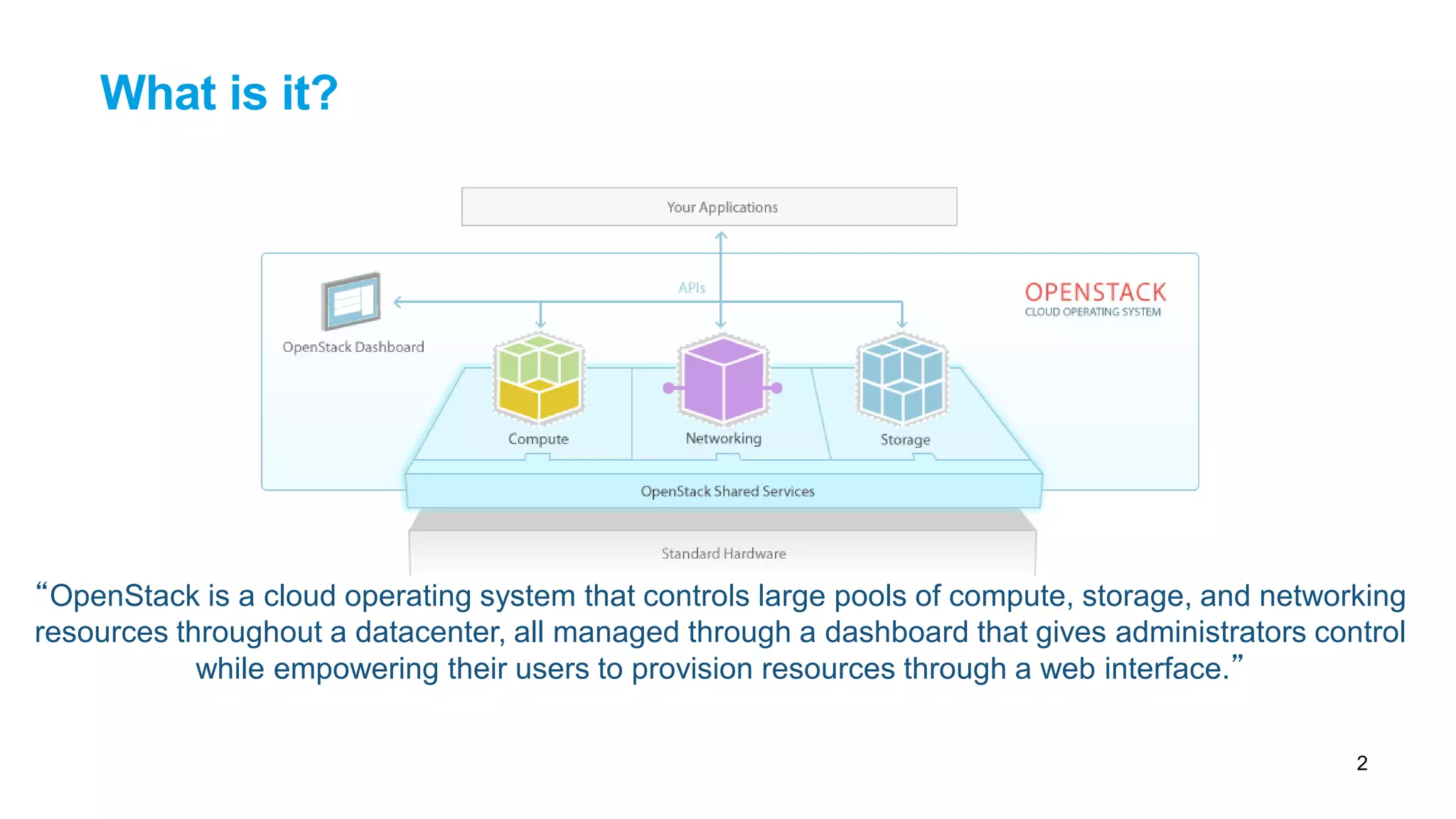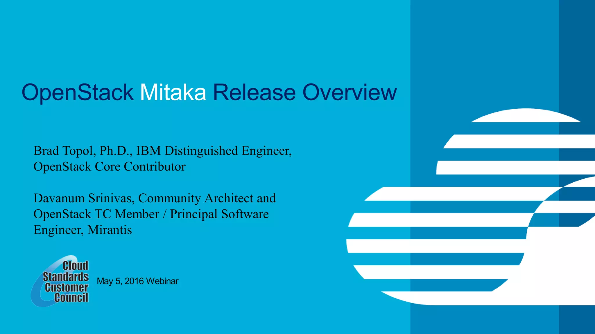 The OpenStack Mitaka release overview highlights OpenStack as a cloud operating system that manages compute, storage, and networking resources through a user-friendly dashboard. The release enhances user experience with improved features across various components such as networking, storage, and security, while also focusing on community growth and collaboration. Key themes include improved manageability, scalability, and a growing user base adopting OpenStack in sectors like telecom and big data.