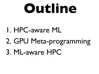 This document discusses using high-performance computing for machine learning tasks like analyzing large convolutional neural networks for visual object recognition. It proposes running hundreds of thousands of large neural network models in parallel on GPUs to more efficiently search the parameter space, beyond what is normally possible with a single graduate student and model. This high-throughput screening approach aims to identify better performing network architectures through exploring a vast number of possible combinations in the available parameter space.