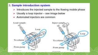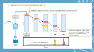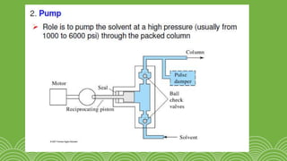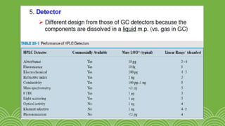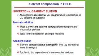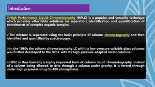 HPLC is a popular and versatile technique for separating, identifying, and quantifying constituents of complex organic samples. It works by forcing a pressurized mobile phase through a column containing a stationary phase, which interacts differently with different compounds and allows them to be separated. Key components of an HPLC system include the pump, injector, column, detector, and data analysis software. HPLC can separate compounds based on differences in how strongly they interact with the mobile and stationary phases.