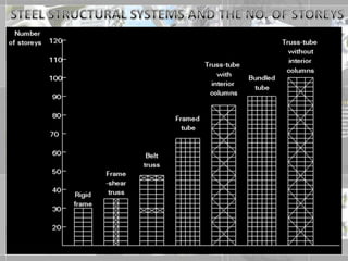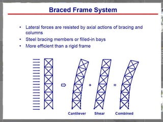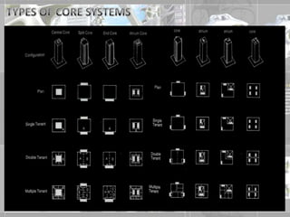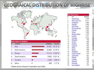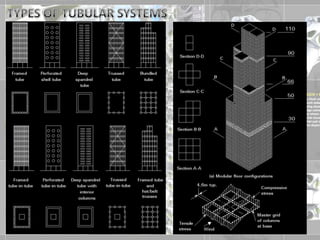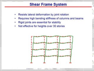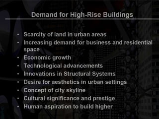 The document discusses various aspects of high-rise structural systems, defining high-rise buildings and outlining their characteristics according to different standards. It elaborates on load types, structural systems such as shear walls and framed tubes, and innovative construction techniques like slip forming and jump forming. The text emphasizes the materials used and the advantages and challenges in high-rise construction, particularly focusing on how to effectively manage loads and structural integrity.