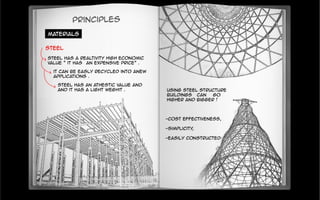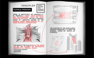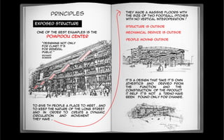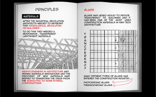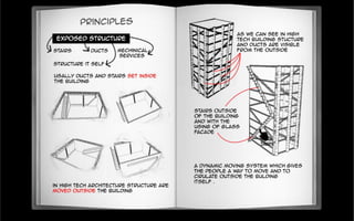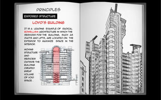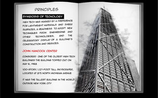 The document discusses several architectural styles including high-tech architecture. It provides definitions and examples of high-tech architecture, noting that it emerged in the late 20th century using modern industrial materials and emphasizing functional elements on building exteriors. Several pioneering high-tech architects are profiled such as Norman Foster, Richard Rogers, and Nicholas Grimshaw. Key high-tech works like the Pompidou Center, Lloyd's Building, and City Hall in London are described in detail, highlighting their innovative structural designs and emphasis on technology.