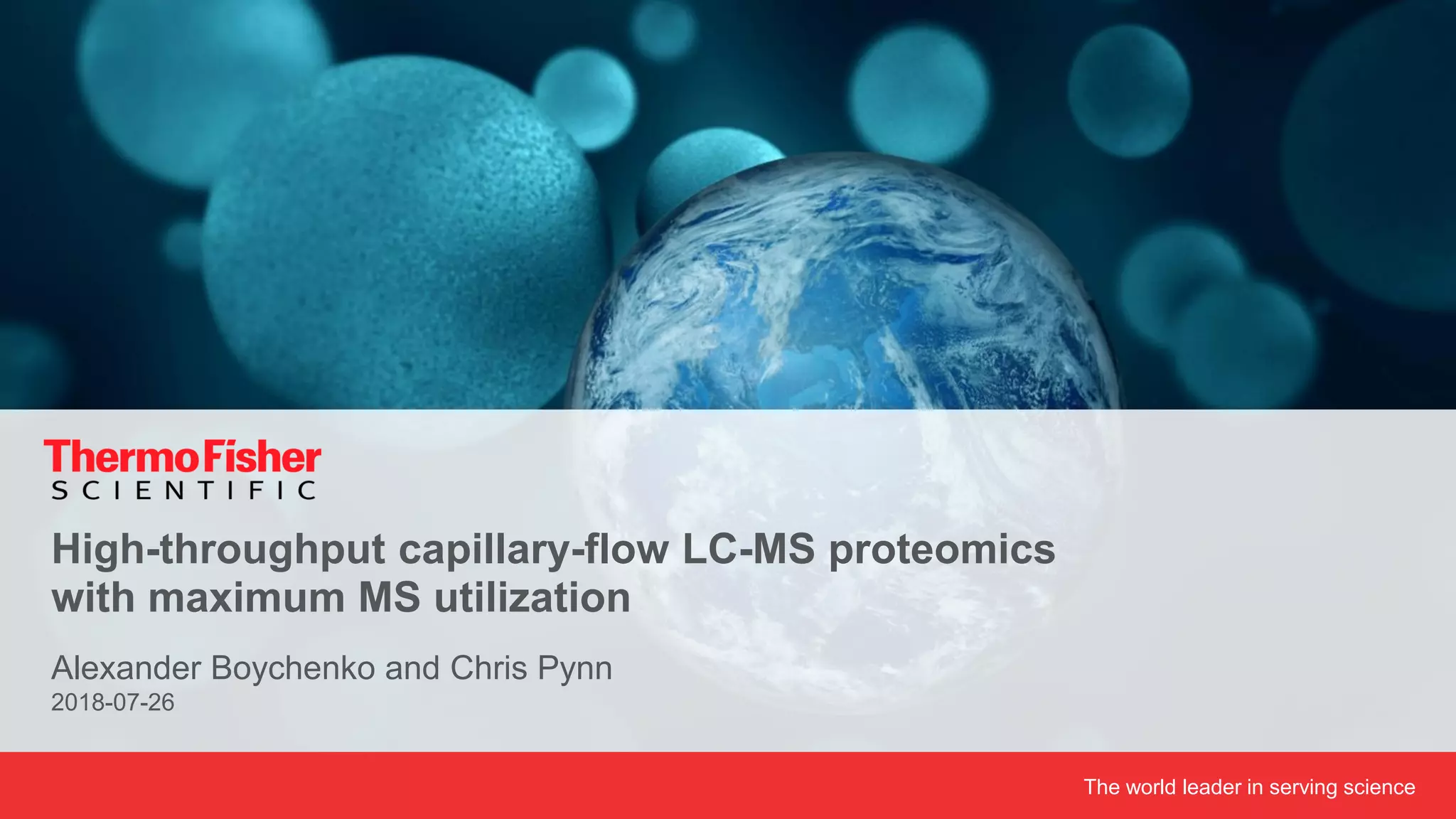 The document discusses advancements in high-throughput low-flow LC-MS proteomics, highlighting various Thermo Fisher systems designed for optimal sensitivity and throughput. It emphasizes the benefits of using capillary and nano flow rates, showcasing methods for maximizing mass spectrometry utilization while maintaining rapid sample processing. Additionally, it presents applications for biomedical research, biomarker validation, and food safety testing, reinforcing the importance of robust and efficient analytical workflows.