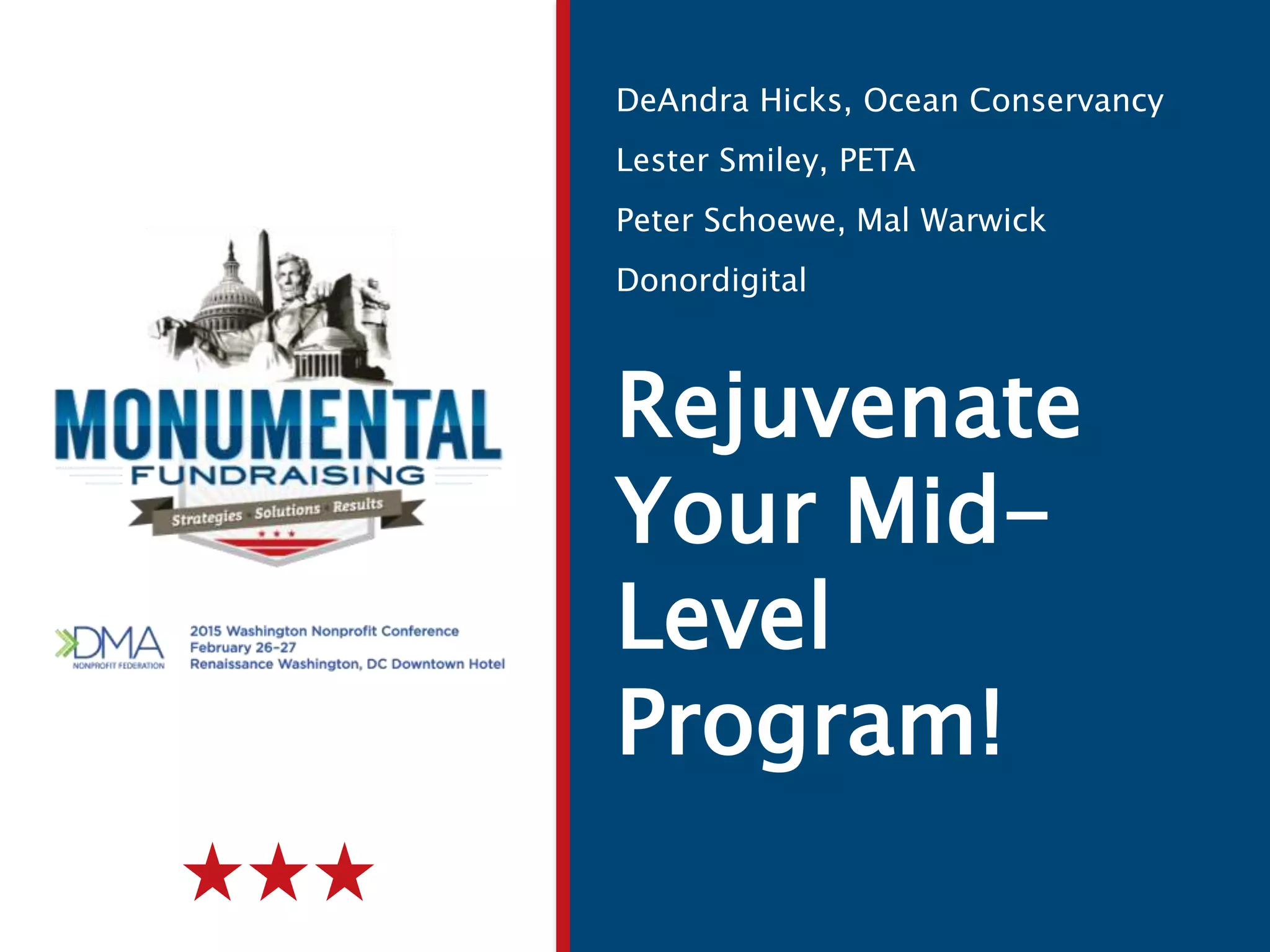 The document discusses strategies for rejuvenating mid-level donor programs at organizations like Ocean Conservancy and PETA, emphasizing the importance of year-round engagement and targeted communication to increase donor upgrades and retention. Case studies highlight successful methods, such as multichannel approaches and innovative campaign designs, which have led to significant revenue growth and donor acquisition. Key insights include focusing on new donor prospects and optimizing online donation forms for mid-level contributions.