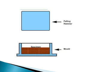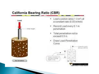 This document discusses materials used in highway construction. It outlines seven major materials: bituminous materials, soil, aggregates, Portland cement concrete, admixtures, pavement marking materials, and structural steel. For each material, it provides details on composition, properties, and relevant tests used for evaluation and quality control of the material. Key tests discussed include moisture content value, California bearing ratio, Los Angeles abrasion value, and specific gravity and water absorption.