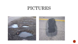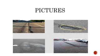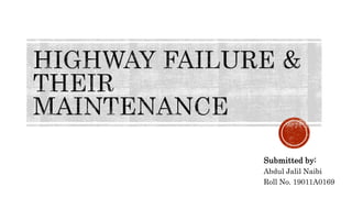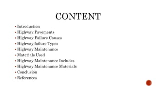 This document discusses highway pavements and maintenance. It describes the main types of highway pavements as flexible like bituminous, and rigid like cement concrete. The major causes of highway failure are rutting, heavy loads, instability and cracking. Highway maintenance aims to preserve the road, provide safety and efficient travel, and includes activities like patching, sealing, resurfacing, drainage maintenance, snow removal, bridge upkeep and traffic services. Key materials used are concrete, bitumen, asphalt and gravel. Periodic maintenance is needed to prolong a highway's lifespan.