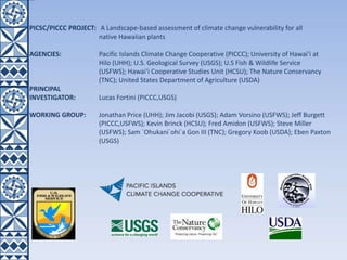 The document summarizes two projects related to conservation and climate change in Hawaii. The first project evaluates the vulnerability of all native Hawaiian plant species to climate change using landscape-based modeling of species' climate envelopes and projected habitat shifts. Some species are projected to lose all suitable climate space by 2100. The second project models changes in dominant vegetation composition across Hawaii driven by climate variables, using over 145,000 vegetation plot records. Preliminary results project shifts in abundance of key native species like Metrosideros polymorpha under climate change. Both projects aim to inform conservation planning and resource management in Hawaii.