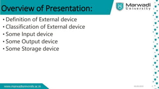 The document provides an overview of different types of external devices that can be connected to a computer. It defines external devices as those that provide an interface between the computer and external environment to exchange data and control signals. External devices are then classified into three main categories: input devices, like keyboards and mice, that provide data to the computer; output devices, like monitors and printers, that receive data from the computer; and storage devices, such as hard drives and flash drives, that hold data either temporarily or permanently. Examples of specific devices within each category are also outlined.
