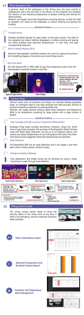 The document outlines the importance of maintaining mining production during lockdowns in South Africa while ensuring employee safety through rigorous screening measures. It describes various Hikvision solutions, including temperature screening terminals, walk-through metal detectors, and handheld devices for monitoring employee temperatures and mask compliance at entrances and work areas. These technologies aim to minimize health risks by providing rapid, accurate screening and real-time alerts at different points in the mining operations.