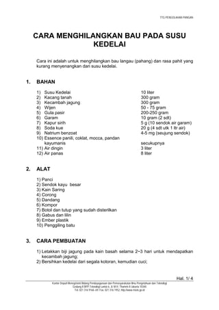 Dokumen tersebut memberikan cara untuk menghilangkan bau dan rasa pahit dari susu kedelai dengan mencampur kedelai, kecambah jagung, kacang tanah, dan wijen lalu menggilingnya menjadi bubur. Bubur kedelai dimasak hingga mendidih untuk menghasilkan susu kedelai yang kemudian dipasteurisasi. Kacang tanah dan kecambah jagung berfungsi melembutkan susu sedangkan wijen menghilangkan bau ke