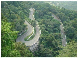 This document discusses hill roads and their design. It defines a hill road as one with a cross slope of 25% or more. It classifies hill roads based on their terrain and organization. Some key points: