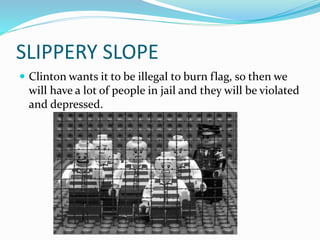 This document criticizes Hillary Clinton and her policy positions using logical fallacies. It claims that Clinton wants to ban flag burning, which would result in many arrests and depressed people in jail. It also argues that Clinton supports the military without having military experience, and that her one term as senator has made her feel powerful and that she wants to be president just because her husband was president. The document uses fallacious reasoning to attack Clinton on issues like abortion, immigration, and portray her as lazy.