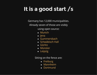 The document discusses the increasing adoption of free and open-source software (FOSS) by public administrations across Europe, highlighting significant savings and efficiencies gained from its use. Examples from various sectors demonstrate how FOSS is utilized in areas like e-government, healthcare, and education, with notable implementations in municipalities and ministries. Challenges remain, including political support and procurement practices that hinder broader adoption, despite the recognition of FOSS's value for responsible government and sustainability.