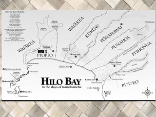The document provides information about the district of Hilo on the island of Hawaii. It discusses the boundaries of Hilo, notable regions within Hilo including Hilo Hanakahi and Hilo One. It also discusses the winds and frequent rain in Hilo and includes several traditional sayings that reference the rainy climate. Additional details are given about the soil quality, population size, history of settlement, and an annual hula festival called the Merrie Monarch Festival.