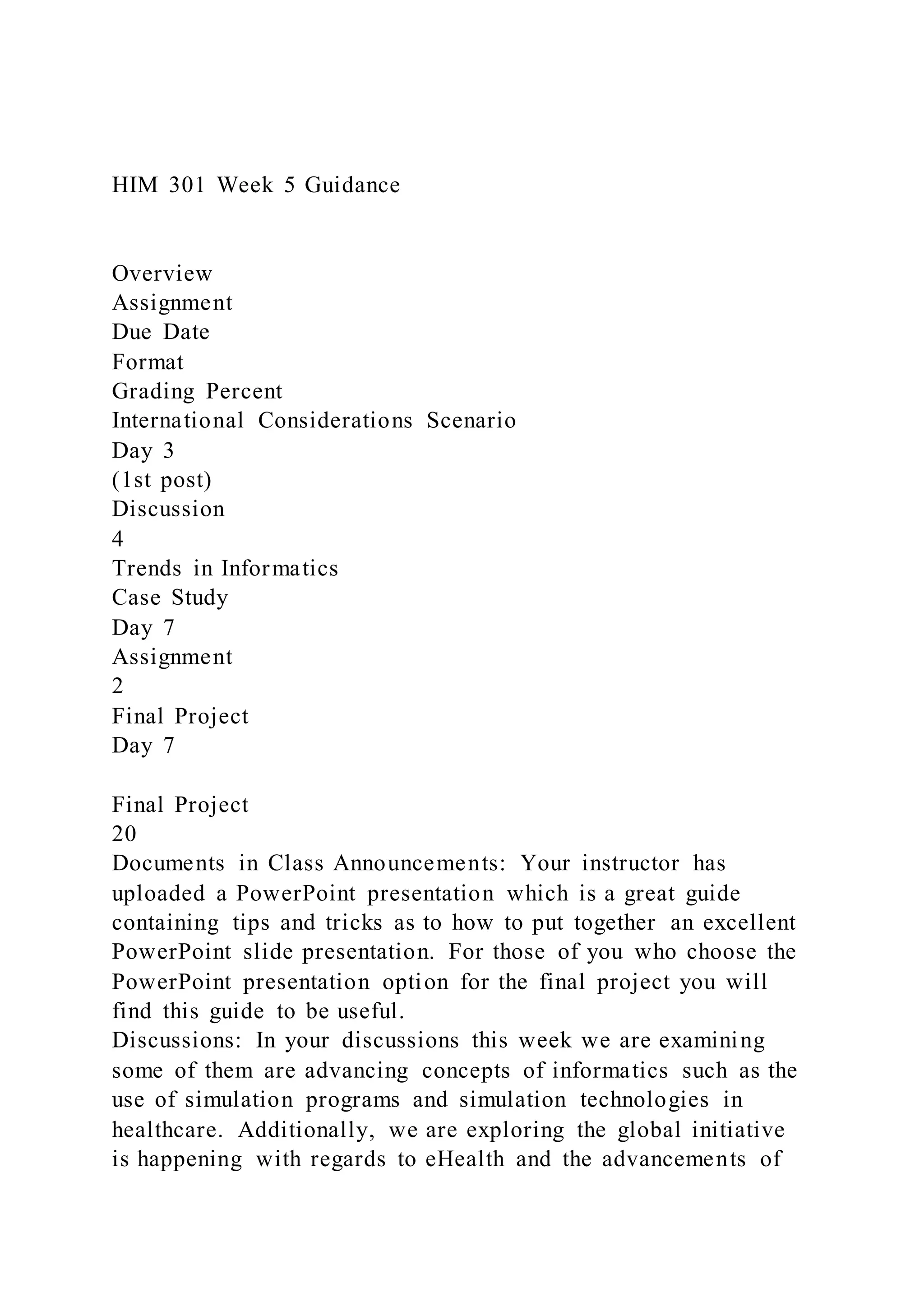 The document outlines the requirements for Week 5 assignments in a health informatics course, including a final project presentation that can be delivered via audio-visual format or PowerPoint. Students are expected to delve into trends in health informatics, analyze simulation technology, and address ethical issues, laws, and data capture technologies relevant to their chosen topic. Additionally, they must follow APA guidelines, incorporate scholarly sources, and ensure that the final presentation is educational and well-researched.