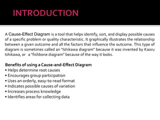 The document discusses a cause-effect diagram, also known as an Ishikawa or fishbone diagram, which is a tool used to identify and display potential causes of a problem or quality characteristic. It then provides an example cause-effect diagram analyzing the root causes of poor student placement. Some of the key causes identified include lack of student interest, poor soft skills, inadequate advising and career counseling, and limited course offerings. Finally, the conclusion states that creating this diagram increased understanding of the various factors responsible for poor student placement outcomes.