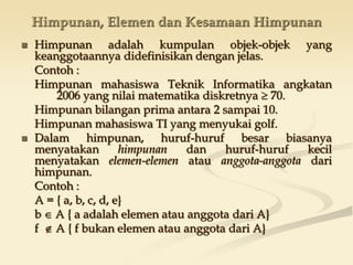 Dokumen tersebut memberikan penjelasan tentang konsep dasar himpunan, termasuk definisi himpunan, elemen himpunan, kesamaan himpunan, subset himpunan, operasi-operasi dasar pada himpunan seperti irisan, gabungan, selisih, dan produk kartesian himpunan.