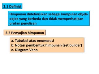 Teks tersebut membahas tentang definisi dan penyajian himpunan, termasuk tabulasi, notasi pembentuk himpunan, diagram Venn, kardinalitas, himpunan kosong, subset, kesamaan, ekivalensi, saling lepas, himpunan kuasa, dan berbagai operasi himpunan seperti irisan, gabungan, komplemen, selisih, beda setangkup, perkalian Kartesian, dan prinsip inklusi-eksklusi.