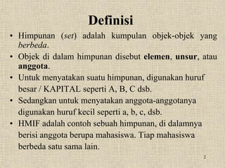 Dokumen ini membahas tentang konsep himpunan, termasuk definisi, cara penyajian, dan operasi dasar yang berkaitan dengan himpunan. Terdapat penjelasan mengenai keanggotaan, kardinalitas, himpunan kosong, himpunan bagian, dan operasi seperti irisan, gabungan, dan selisih. Selain itu, dijelaskan juga tentang himpunan terhingga dan tak hingga serta berbagai notasi matematik yang relevan.