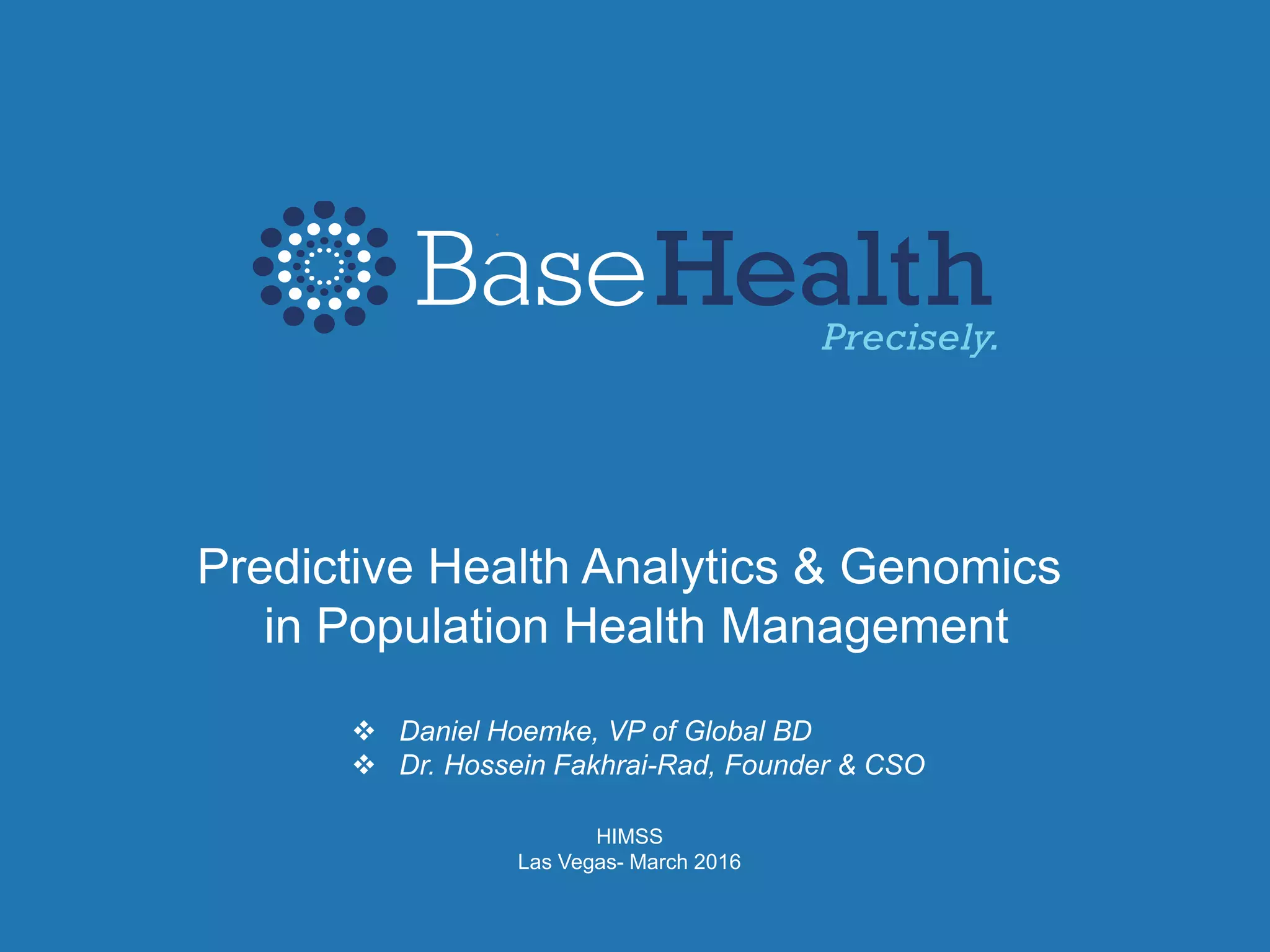 The document discusses the importance of predictive health analytics and genomics in managing population health, emphasizing the need for systematic approaches to prevent chronic diseases, which are expected to affect 49% of Americans by 2025. It highlights the BaseHealth technology platform, which utilizes extensive data sources to generate personalized risk assessments and improve disease prevention strategies. Additionally, it outlines the rising healthcare costs and the potential benefits of proactive health management through analytics and technology.