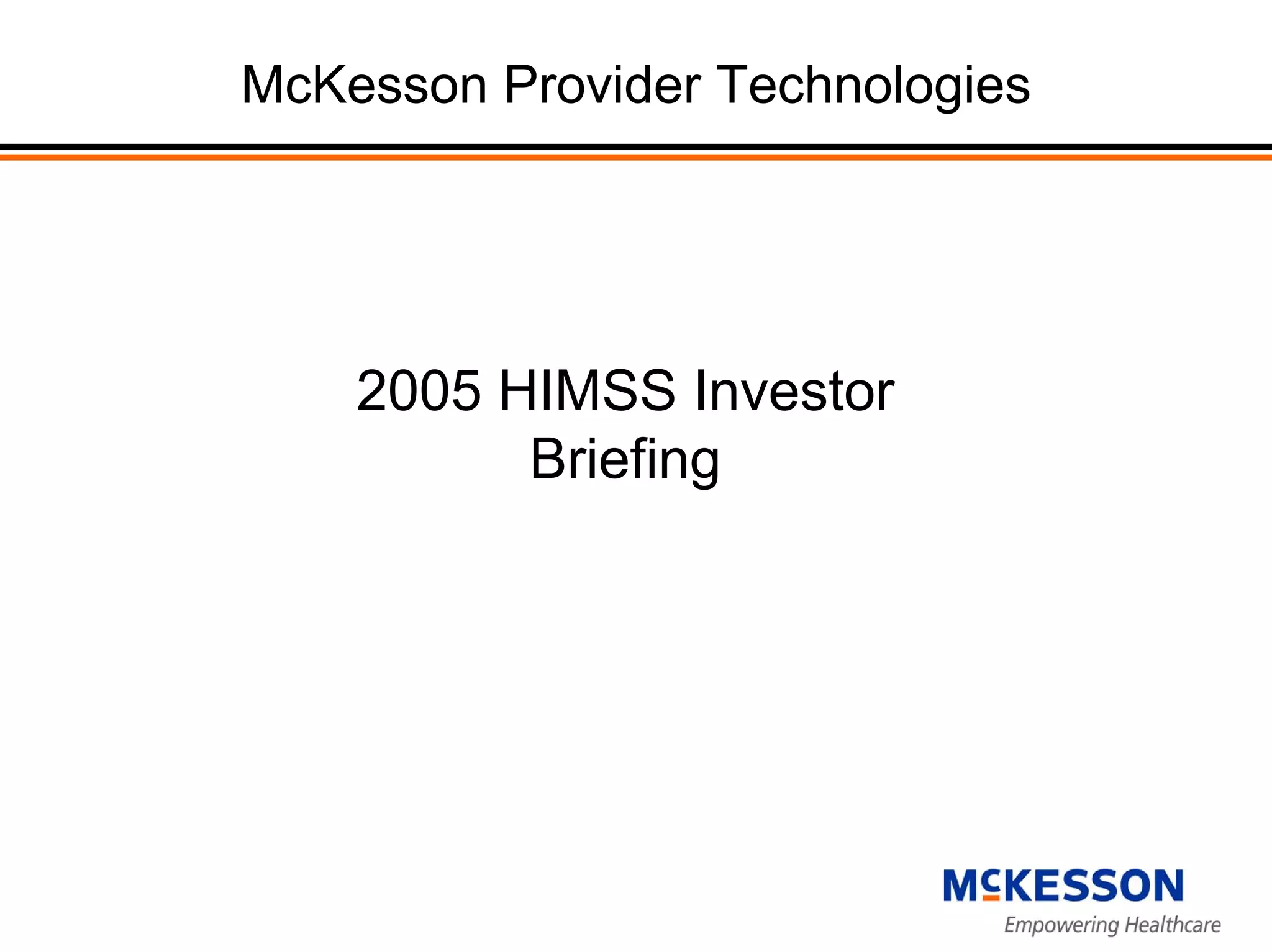 The document provides information about McKesson Provider Technologies, including its medication safety solutions for both inpatient and ambulatory settings. It discusses the company's focus on broadscale adoption of technology through solutions that integrate with existing IT systems, as well as through a "surround strategy". Examples are given of implementations at Duke University Hospital and Centra Health that achieved rapid deployment through joint accountability between the organizations and McKesson. Customer testimonials from Duke and Presbyterian Health Services emphasize optimizing clinical workflow and focusing on the patient's perspective in defining technology success.