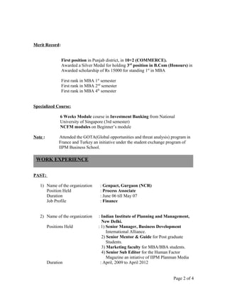 Mrs. Hina S Kumar is seeking a career opportunity with a dynamic team. She has a Post Graduate Degree in Planning and Management from IIPM New Delhi with specializations in Finance and Marketing. She has work experience with Genpact and IIPM. At IIPM, she held several roles including Business Development, Faculty, and Editor. She is currently pursuing her MCOM from IGNOU. Her educational qualifications include high marks from B.Com, MBA, and 10+2. She has received several scholarships and awards for academic performance.