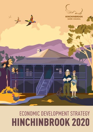 The document provides an economic development strategy for Hinchinbrook Shire called Hinchinbrook 2020. It identifies five key themes, referred to as "The Big Five", to guide economic development projects through 2020. The themes are dynamic centres, fields of success, authentic destination, local knowledge, and collaborative partnerships. The strategy's vision is to create a culture of entrepreneurship by capitalizing on existing assets and natural beauty. This will be achieved through identifying growth opportunities, supporting entrepreneurs, and attracting new businesses. The goals are improving tourism, diversifying agriculture, making farming easier and more enjoyable, and creating a strong regional brand called "The Hinchinbrook Way".