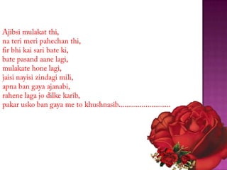 The document discusses the beauty of love and how it brings people together. It describes love as making life meaningful and helping overcome difficulties. Love is said to provide comfort in times of need and teach one how to live and experience joy. The document expresses how finding a partner in life can enrich one's existence and bring fulfillment.