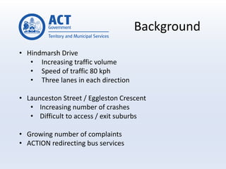 This document summarizes a feasibility study of improving three intersections along Hindmarsh Drive in Canberra: Eggleston Crescent, Launceston Street, and the Tuggeranong Parkway southbound off-ramp. The study analyzed traffic volume, speed, and crash data to identify options for improving safety and access. Options considered included closing/reopening streets, adding turn lanes, roundabouts, and traffic signals. The recommended and draft designs proposed traffic signals at each intersection to improve traffic flow and safety along the busy arterial route while minimizing impacts to residents and congestion. Subject to funding, construction was anticipated to begin in late 2016.