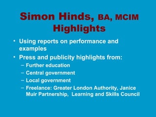 Simon Hinds has experience working in communications roles in various sectors including education, local and central government, and freelance. He has strong performance in delivering work, organizing, building relationships, and working under pressure. He has industry-recognized training in marketing, communications, journalism, and is a member of the CIM marketing body. His experience includes developing communications strategies and campaigns, writing for websites and publications, handling media enquiries and crises, using social media, photography, and drafting releases which have resulted in positive media coverage.