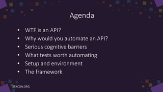 This document provides lessons learned about automating API testing. It discusses what an API is and reasons for automating API tests, including getting clear responses close to the client experience. The document outlines different types of tests to automate, including status code checks, structure checks, and scenario checks. It also discusses cognitive barriers to testing, test setup and environment, using an automation framework, and splitting test logic from application logic. The goal is not to provide a how-to guide but rather discuss lessons learned about effective API testing.