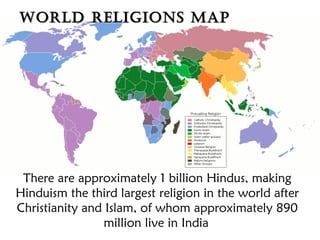 Hinduism is one of the world's oldest religions originating in India with no single founder. It is a diverse set of beliefs and traditions with approximately 1 billion adherents worldwide, most living in India. Core Hindu beliefs include reincarnation, dharma, karma, and samsara. Hindus worship many gods like Brahma, Vishnu, Shiva and their avatars while believing in an overarching divine power called Brahman. Caste, the varna system, and concepts like moksha also play important roles in Hindu philosophy and way of life.