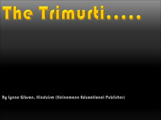 The Trimurti are the three primary aspects of the divine in Hinduism - Brahma the creator, Vishnu the preserver, and Shiva the destroyer. Each has distinct iconography and roles: Brahma has four heads, Vishnu holds a conch and discus, and Shiva dances in cycles of creation and destruction. They represent different aspects of the supreme being Brahman. Hinduism differs from Islam in allowing multiple representations of the divine rather than one singular God.