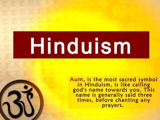 Hinduism originated on the Indian subcontinent and has no single founder. It is characterized by beliefs in reincarnation and dharma, and encompasses a variety of traditions with diverse beliefs. The main Hindu deities form a Trimurti of Brahma the creator, Vishnu the preserver, and Shiva the destroyer. Other important concepts include karma, moksha, and various festivals and practices such as puja and yoga.