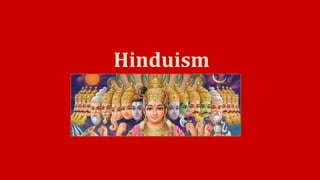 Hinduism is one of the world's oldest religions, originating over 4,500 years ago in India. It is practiced by over 800 million Hindus worldwide, with the majority living in India. Hindus believe in Brahman, the supreme spirit or soul, and that individuals have their own souls (atman) that are reincarnated after death. They worship many gods and goddesses like Shiva, Vishnu, and Ganesh. Important Hindu symbols include Aum, the lotus, and the cow. Major festivals celebrated are Diwali, the festival of lights, and Holi, the festival of colors.