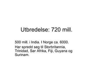 Utbredelse: 720 mill.500 mill. i India. I Norge ca. 6000. Har spredd seg til Storbritannia, Trinidad, Sør Afrika, Fiji, Guyana og Surinam.
