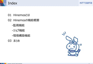 Hinemosは、システム運用管理で要求される各種機能を備えた、「統合運用管理ソフトウェア」です。 本資料は、2016/1/27(水)開催 システム監視の決定版!Hinemos ver.5.0による運用監視セミナ 『システム監視の決定版!Hinemos監視機能のご紹』セッション講演資料となります。